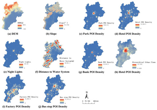 In this study, the data underwent appropriate data processing. For the land use data, the impervious surface data were selected to represent the urban areas, while the water body data were used as a limiting condition. POI density data were generated through kernel density analysis, and the Euclidean distance tool was used to process national highways, provincial roads, expressways, water systems, and the central elements of each county and city. Slope data were calculated based on the original DEM data. The urban flow data comprehensively considered relevant indicators of economic flow, traffic flow, population flow, and information flow, and was processed using weighted summation. Finally, the above-mentioned data were resampled and uniformly processed into a resolution of 30 m × 30 m.