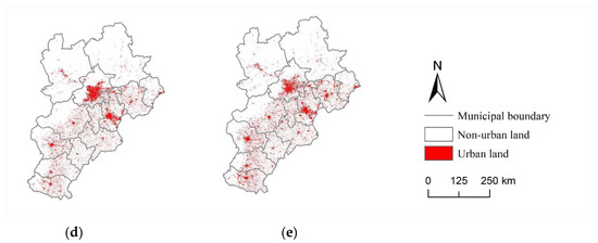 The final accuracy validation serves as a criterion for assessing the reasonableness of the model parameter settings and their applicability to the study area. This validation is measured using the Kappa coefficient, overall accuracy, and the figure of merit (FoM) index. These metrics quantitatively reflect the simulation’s effectiveness and can also be employed to evaluate the consistency between the two maps. In this paper, the data from 2000 and 2010 are used to predict the urban land in 2020. The overall accuracy of urban land prediction by integrating the hierarchical urban flow layer is found to be 0.981, the Kappa coefficient is 0.906, and the FoM index is 0.979. This shows that an excellent simulation effect can be obtained by considering the hierarchicality among cities when predicting the urban expansion of the BTH region.
