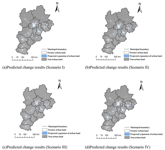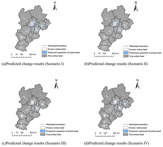 In terms of the direction of expansion, all four sets of scenarios predict significant urban expansion in Beijing–Tianjin–Tangshan and south-central Hebei. Scenarios I and II not only predict the significant outward expansion of cities in these regions but also predict a clear trend of the group-type expansion of cities driven by the central cities of the Beijing–Tianjin Rim, Tangshan, and its environs. These regions are the high ground of urbanization in BTH and are also the focus of population and industrial agglomeration. They are likely to show group and integrated expansion in the future.