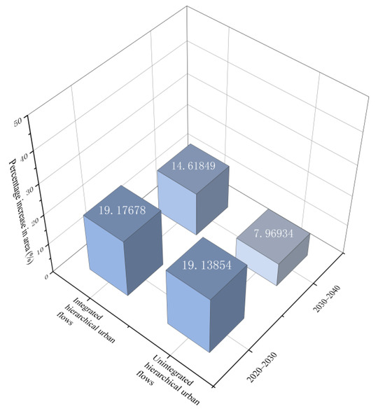 Percentage increase in urban land use area from 2020 to 2040 under different scenarios.
