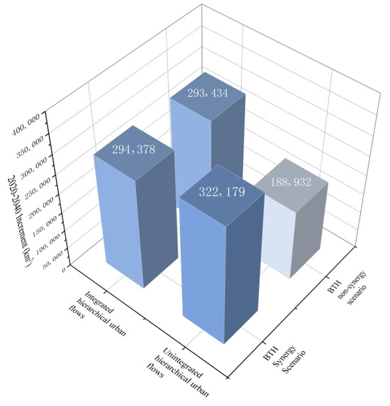 As illustrated in Figure 7, a side-by-side comparison of the scenario results reveals that the predicted changes under the BTH synergistic development scenario exhibit greater stability, demonstrating a smoother trend of urbanization expansion. This stability may be closely related to regional synergistic development and the strong interconnections among the cities. With the acceleration of the regional integration process in BTH, transportation, economic, and resource sharing among cities have been significantly enhanced. This development has contributed to the rapid urbanization of the entire urban agglomeration while ensuring a degree of coordination and order.