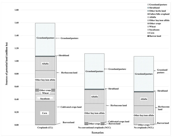 In the No Croplands (NCL) scenario, our analysis identified a total of 1.07 million hectares of land suitable for shrub willow cultivation. Grassland or pastureland accounts for 547,377 ha (51% of the total potential land), while herbaceous land makes up 517,443 ha (48.2%). Smaller contributions come from shrubland (5033 ha) and barren land (3427 ha), which together account for about 1%. Within the herbaceous category, other hay land contributes 296,100 ha (27.7% of the total potential land), alfalfa accounts for 211,928 ha (20%), while idle cropland (5478 ha) and other herbaceous land (3936 ha) together make up about 1% (Figure 1).