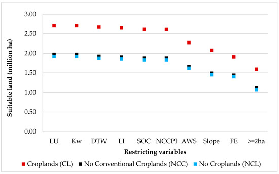 Change in the amount of suitable land with intersecting growth restricting variables for each of the three scenarios (Cropland, No Conventional Croplands, and No Croplands). (Note: LU = current land use, Kw = soil erodibility K-factor, DTW = distance to surface waterbody, LI = soil nitrate leaching index, NCCPI = national commodity crop productivity index, SOC = soil organic carbon storage within 30 cm, Slope = soil topography, AWSC = soil available water storage capacity within 30 cm rootzone, FE = field efficiency, and ≥2 ha = land parcel size greater than 2 ha).