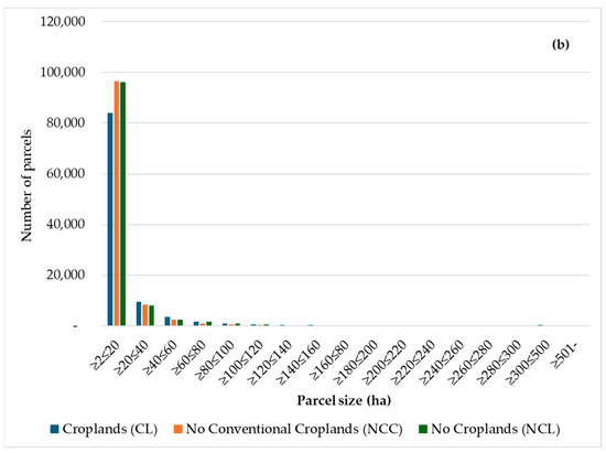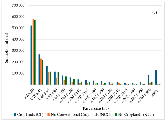 Distribution of (a) hectares of suitable land and (b) number of parcels in different scenarios by parcel size.