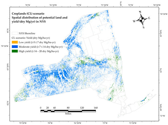 Spatial distribution of potential land and potential yield of willow biomass crops in the Croplands scenario (CL) in NYS.