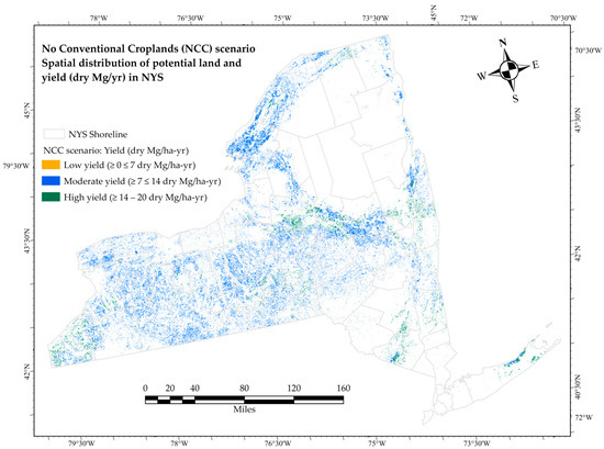 Spatial distribution of suitable land and potential yield of willow biomass crops in the No Conventional Crops scenario (NCC) scenario in NYS.