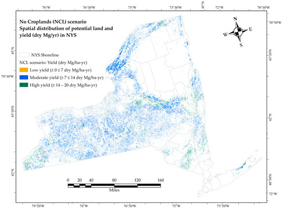 Spatial distribution of suitable land and potential yield of willow biomass crops in the No Cropland Scenario (NCL) in NYS.