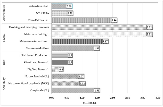 Achieving the 2030 target of producing 5.91 × 1013 GJ (56 TBtu) of energy from purpose-grown biomass in the SULCF scenario would require an annual production of around 6.73 million dry Mg of biomass (Figure S1) [2,23,24]. Based on the previously estimated average yield of 9.1 dry Mg/ha-yr for the region [24], 0.74 million hectares (ha) of land would be required to produce this amount of purpose-grown biomass. However, currently, only 400–500 ha of willow biomass crops are grown in NY, and there are no biorefineries for producing renewable biofuels from purpose-grown willow biomass in NYS. Consequently, a substantial increase in land use would be required to cultivate enough purpose-grown biomass to meet the demand for renewable fuels [25,26]. The projections in the scoping plan raise questions about whether NYS possesses sufficient available land and the potential to produce the required quantity of purpose-grown biomass to achieve the renewable fuels production target.