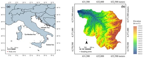 Location (a) and digital elevation model (b) of the study area. Locations of soil sampling points are also reported. In Figure 1b, coordinates are reported using the World Geodetic System (1984) with the Universal Transverse Mercator zone 33 North Projection (WGS84 UTM 33N).