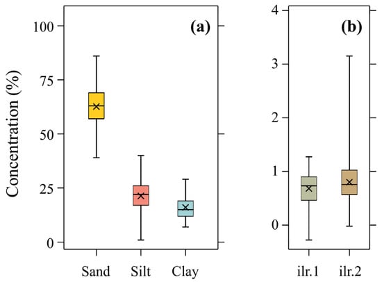 Box plots of the (a) soil textural particle size fractions (sand, silt, and clay) and (b) isometric log-ratio (ilr) transformed data (ilr.1 and ilr.2).
