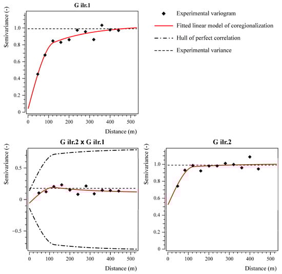The two Gaussian isometric log-ratios (G ilr.1 and Gilr.2) were used to calculate two variogram maps and no relevant difference in the semivariance of G ilr.1 or Gilr.2 as a function of direction (anisotropy) was detected. Therefore, isotropic direct and cross-variograms were calculated (Figure 3).