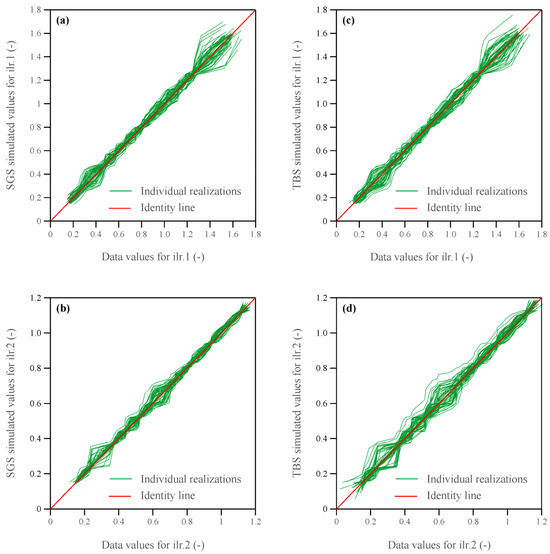 The distributions of the realizations ilr.1 and ilr.2 coordinates obtained by SGS and TBS were compared with the distributions of original data through quantile–quantile plots. On average, over 100 realizations, it is expected that the distributions of individual realizations versus the distribution of original ilr.1 and ilr.2 coordinates data fit the diagonal line, indicating an accurate reproduction of data distribution.