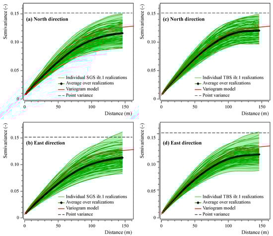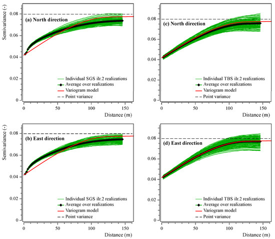 Regarding the variograms’ reproduction, they were calculated for multiple SGS/TBS realizations and compared to the input variogram model in the same directions. The model variogram should be reproduced within acceptable ergodic fluctuations [64].