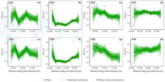 Moreover, swath plots were used for providing comparisons between measured data (ilr.1 and ilr.2) and SGS/TBS cosimulated values to identify any bias towards under-estimation or over-estimation, or any smoothing in the results. In this study, the swath plots are graphical representations of measured and SGS/TBS cosimulated realizations of ilr.1 and ilr.2 coordinates derived from a series of sectional zones or bands (swaths), generated in two-dimensional sections that are propagated by a given step size along the vector normal to the sectional data [77]. A swath plot can be constructed along any vector to allow one to analyze how the property of interest changes along that vector. In this study, the swath plots were computed along north and east directions using a slice size in both directions of 200 m.