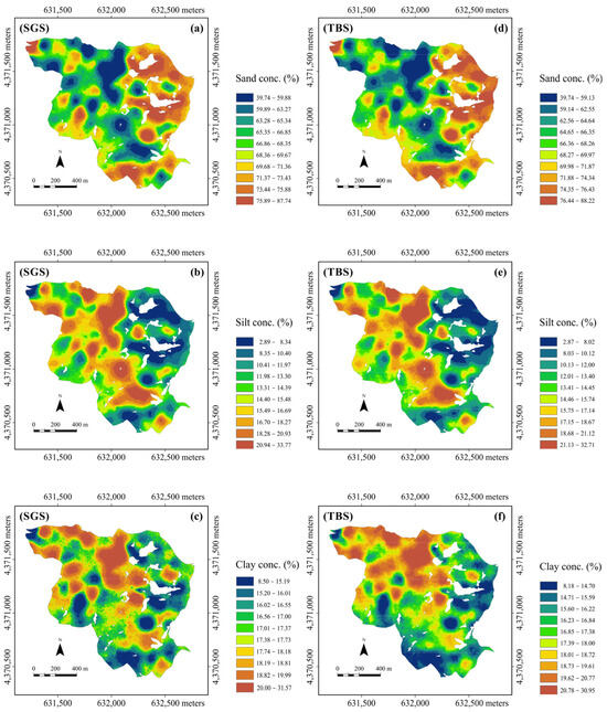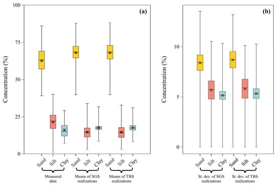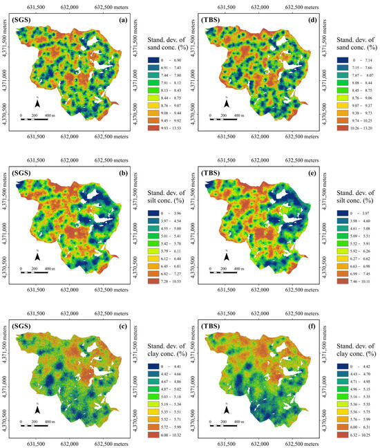 Finally, the maps of the estimated expected values for each of the three soil textural fractions obtained by SGS and TBS showed a similar distribution with no notable visual differences or visual artifacts. What was reported for the maps of the expected values of the three soil textural fractions also applies to the standard deviation maps of the realizations obtained by SGS and TBS. These maps represent the distribution of spatial uncertainty and show both a similar spatial distribution and range of variation for each textural fraction with no relevant difference.
