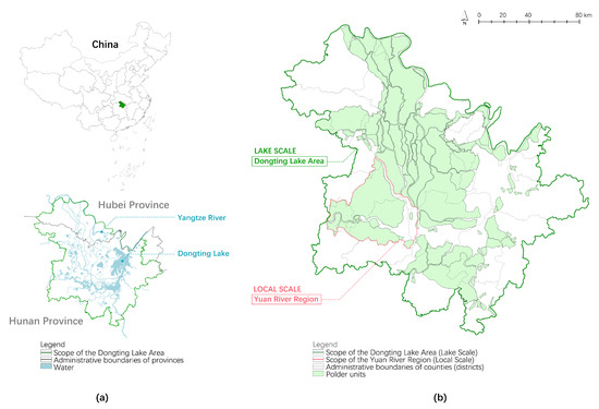 This study was conducted at two different scales. At the Lake Scale, the study scope is the DLA, which consists of the boundaries of 22 counties (districts) as well as the boundaries of polder units primarily located in these counties (districts). This study scope encompasses a total area of approximately 30,002 km2 (Figure 1b). At the Local Scale, the Yuan River region was selected as a typical case, since it was a relatively independent natural geographic region and was one of the earliest regions engaged in polder reclamation in the DLA [2,22]. This study scope was defined by the LCAs associated with the polder units of the Yuan River region and the surrounding wetland environment that were occupied at the previous scale (Figure 1b).