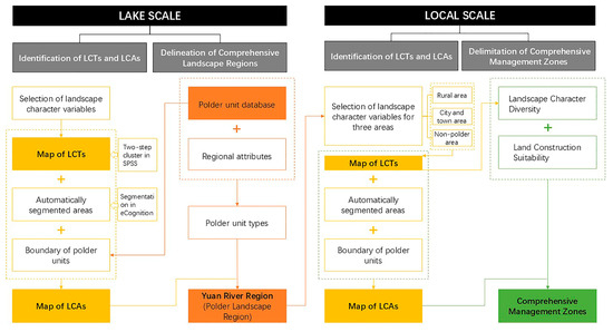 In this study, the LCA method combined with polder typology was employed in two distinct scales. At the Lake Scale, the LCA method was utilized to identify and delineate polder LCTs and LCAs, as well as to establish a comprehensive method for categorizing polder unit types and zoning polder landscape regions. At the Local Scale, the LCA method was integrated with analyses of LCD and LCS to delineate different management zones for polder landscapes (Figure 2).