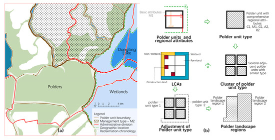In this study, we focused on the polder landscape in the Dongting Lake Area (DLA) of China as a case study. The polder landscape in the DLA has a long history of development and is widely distributed. As one of China’s major commodity grain production bases [21], it serves as a typical representative of polder landscapes in the middle and lower reaches of the Yangtze River. By combining the polder typology method with the LCA framework, the landscape character types (LCTs) and landscape character areas (LCAs) of the polder landscape was identified at two scales; by integrating the polder landscape database with the semi-automatic segmentation method of the LCA, a rapid and efficient method for identifying polder unit types and delineating polder landscape regions was established, and the medium-scale study scope was defined; furthermore, through the integrative analysis of LCD and the land construction suitability (LCS) assessment, comprehensive landscape management zones were delineated, and corresponding strategies were proposed based on different conservation or development purposes. This study aims to preserve the distinctive regional characteristics of polder landscapes while concurrently promoting the sustainable development of lowland environments. By identifying the landscape character and delineating landscape management zones, the objective of this study is to provide a foundation and baseline for the effective management and strategic planning of polder landscapes.