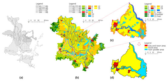 The delimitation of the Yuan river region: (a) eight polder unit types, (b) the boundary of the Yuan river region, (c) LCAs in the Yuan river region, (d) three areas in the Yuan river region.