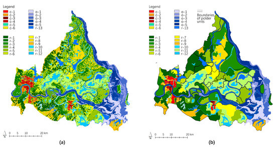 The initial delineation of LCAs was conducted through the Multi-resolution Segmentation tool in eCognition 9.0. The segmentation was considered appropriate with the following parameters: scale (40), shape (0.2), and compactness (0.1), resulting in a total of 345 areas. In addition to the process mentioned in 2.2.4, the specific manual adjustment involved two additional steps (Figure A1): (1) The fragmented areas in the rivers between the polder units were consolidated into eight LCAs based on corresponding water systems, collectively referred to as ‘Inter-polder River’. (2) The LCAs dominated by Type 3 were subdivided into two distinct parts: Type 3A (natural land) and Type 3B (construction land). Ultimately, a total of 433 LCAs were delineated, including 254 LCAs inside the polders and 179 LCAs outside the polders, as shown in Figure 4b.