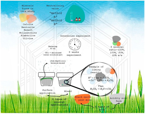 Figure 1. Experimental design outlining key parameters, including the types of minerals used, liming measurement methods, mineral application techniques, mineral-to-soil ratios, and duration of the experiment.