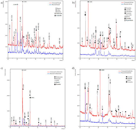 Passivation is the effect of coating the surface of the dissolving mineral with reaction byproducts, slowing the reaction process and reducing the total extent of carbonation [54]. Passivation, as a linkage between silicate dissolution and secondary precipitation affecting carbonation, is one of the questions addressed by recent investigators [49,55,56,57,58,59,60]. It has been proposed that the formation of an amorphous silica layer could act as a passivation coating, which could partly inhibit further dissolution of silicate (e.g., Béarat et al. [61], Huijgen et al. [51], and Kashim et al. [62]), but the formation of secondary minerals can also play this role (more on this in Section 3.1.1.). Additionally, for olivine, the passivation hypothesis can also be related to the atomic ratios. Wollastonite has 1 Ca atom for every Si atom, whereas forsterite has 2 Mg atoms for every Si atom. This means that olivine has less Si to hinder the reaction, allowing it to react more extensively even if slower. These phenomena are in line with the accelerated carbonation tests reported by Huijgen et al. [51] and Chai et al. [52], wherein the maximal reaction extents reported were 70% and 55.7%, respectively. Therefore, a degree of passivation or incongruent dissolution is to be expected with wollastonite, even if it does theoretically weather faster. This also suggests that the NV test is being more predictive of the ultimate reactivity of wollastonite versus olivine, than its weathering rate.