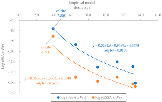 The empirical model is based on the weathering rate of the most reactive mineral in each sample considering its degree of purity, standardized chemical formula, and particle size distribution (PSD). Since the liming response occurs over a short period, it is not the entire rock that reacts but rather its most reactive phase. The modeling focused on these most reactive phases of each mineral to calculate the weathering rates (Wr). For instance, ankerite was selected for kimberlite, fosterite for olivine, and anorthite for basalt.