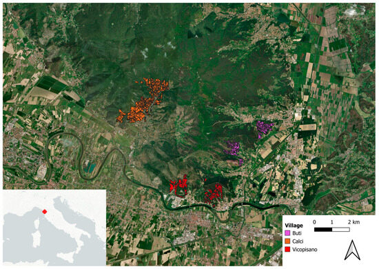 The study area includes the traditional olive groves of the Monte Pisano area, between the Arno and Serchio rivers in the province of Pisa in Tuscany, central Italy. The studied orchards were spread across three villages: Calci, Vicopisano, and Buti (Figure 1).