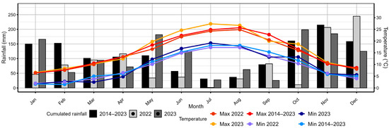 Monthly cumulated rainfall and average minimum and maximum monthly temperature, from January 2022 to December 2023.