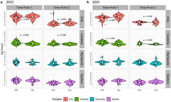 Log-transformed counts of soil-dwelling predators (ants, carabids, myriapods, and spiders) in managed fields close to abandoned fields (MA) and managed fields close to managed fields (MM) across two time points in 2022 (a) and 2023 (b). Black points represent individual fields (3 traps aggregated), and (when present) significant differences between means (white squares) are indicated with lines and corresponding p-values (adjusted using Tukey’s method).