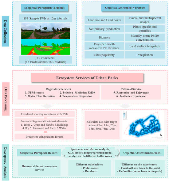The research framework for this study consists of three main components (Figure 3). First, we conduct data collection for both subjective and objective assessment indicators. Subjective perception indicators are derived from participant evaluations of ESs, using PVIs taken every 15 m. Objective assessment indicators are gathered from various spatial geographic elements, climatic data, and web data mining. Second, we conducted subjective scoring and objective assessment for six types of regulating services and cultural services. Subjective evaluation was achieved through manual scoring and random forest prediction of all PVIs, while objective assessment was evaluated cumulatively for ESs within a target radius distance of 8 to 100 m. Finally, we analyzed the perception differences in ESs. Through testing with Spearman correlation analysis, ordinary least squares (OLS) model, and ridge regression model, we ultimately selected the results from Spearman correlation and ridge regression for detailed analysis. The perception difference analysis primarily focuses on the relationships between each ecosystem service, their stakeholders, and the on-site experiences.
