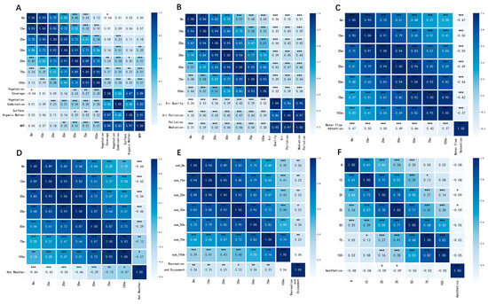 Spearman correlation analysis was employed to examine the relationship between objective assessments and subjective perceptions [110]. The correlation data were visualized with Matplotlib and Seaborn toolkits in Python 3.8. The results are presented in the form of matrix heat maps and line charts. Matrix heat maps can display the positive and negative correlation patterns, with varying color depth representing the strength of correlation. The data marked with an asterisk (*) indicate a significant correlation. Line charts effectively illustrate correlation trends across different buffer radii, facilitating intuitive comparisons among various ecosystem services.