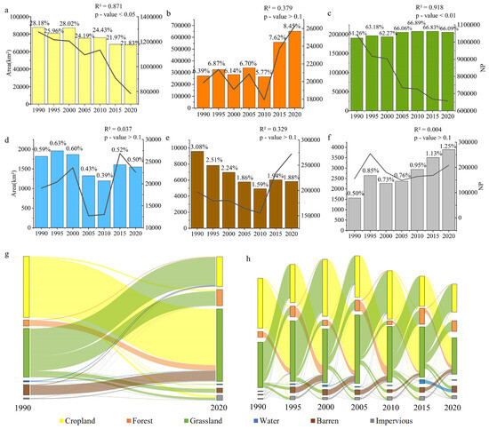 Land use types of area changes from 1990 to 2020 (left axis, a–f) and patch number changes (right axis, a–f) and chord diagrams of land use transition matrices (g,h). (a). cropland, (b). forest, (c). grassland, (d). water, (e). barren land, (f). impervious, (g). Chord diagram of land use transition matrix between 1990 and 2020, (h). Chord diagram of land use transition matrix from 1990 to 2020.