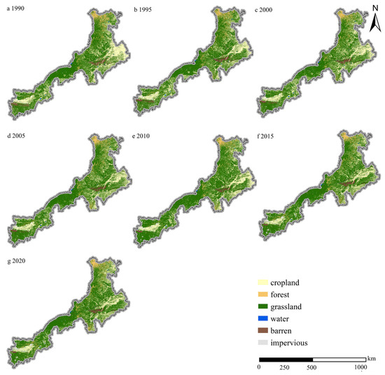 Spatial distribution of land use changes from 1990 to 2020. (a). 1990, (b). 1995, (c). 2000, (d). 2005, (e). 2010, (f). 2015, (g). 2020.