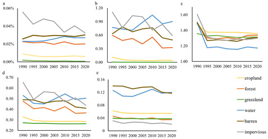 During the study period, the fragility index of cropland, forest, grassland, and impervious decreased, while it increased for water and barren land. The separation degree of cropland, forest, grassland, barren land, and impervious decreased, whereas it increased for water. The fractal dimension, disturbance index, and loss degree of cropland, forest, grassland, water, barren land, and impervious all showed a decreasing trend (Figure 4).