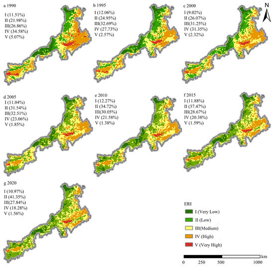 Spatial distribution of LER level of the study area for the years 1990–2020. (a). 1990, (b). 1995, (c). 2000, (d). 2005, (e). 2010, (f). 2015, (g). 2020. (I: Very Low, II: Low, III: Medium, IV: High, V: Very High. The numbers in parentheses indicate the percentage of area for each LER level category.).