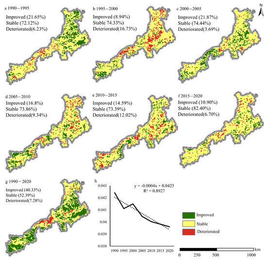 Spatial distribution of changes in LER level in the study area. (a). 1990–1995, (b). 1995–2000, (c). 2000–2005, (d). 2005–2010, (e). 2010–2015, (f). 2015–2020, (g). 1990–2020, (h). the average ERI change line graph for 1990–2020 (“Improved” indicates a decrease in LER level, “Stable” indicates no change in LER level, “Deteriorated” indicates an increase in LER level. Numbers in parentheses represent the percentage of area for each LER level).