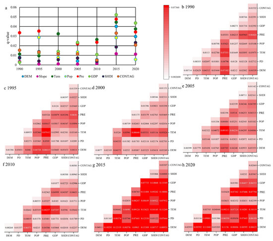Scatterplot of the impact of a single factor and heat map of factor interaction on ERI detection from 1990–2020. (a). q values of each factor, (b). 1990, (c). 1995, (d). 2000, (e). 2005, (f). 2010, (g). 2015, (h). 2020.