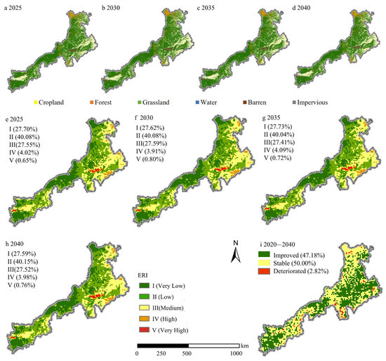 Overall, from 2025 to 2040, the areas with a decrease in cropland and an increase in grassland in this region are mainly located in the southwest and eastern areas (Figure 8a–d). The very high-risk areas will stay mainly in the central and western parts of the study area. Very low-risk areas will be in the central and northern parts. Compared to 2020, some areas in the southwest and east will slowly move from high to medium or low risk. The share of medium-risk areas will slightly drop from 27.55% in 2025 to 27.52% in 2040. High-risk areas will decrease from 4.02% in 2025 to 3.98% in 2040 (Figure 8e–h). By 2040, 47.18% of the area’s ecological risks will be restored. Half of the area will not change in ecological risk level. Only 2.82% will see an increase in risk. Overall, the LER in the study area is expected to decrease over the next twenty years (Figure 8i).