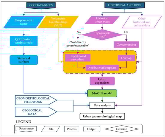 According to Pica et al. [], the study of urban geomorphology requires multi-temporal data and multidisciplinary methods. The methodological framework employed in this study was designed to explore the interactions between anthropogenic urban expansion and natural landforms process [,,].