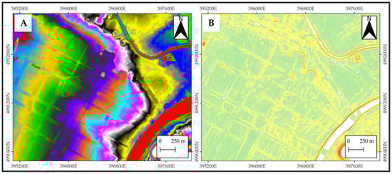 To investigate the relationship between the geomorphological natural landscape and the urban environment, a comprehensive topographic and morphometric analysis was undertaken. The DTM (Digital Terrain Model) was categorized using a false-color elevation-interval technique, resulting in 17 distinct classes, each with a 2 m elevation range (Figure 4A). Comparing this classification with the geological map (see Figure 2) effectively highlights the fluvioglacial fan (located in the southwest in Figure 4A), as well as the lateral fluvial migration zones of the Po and Dora Riparia rivers (northeast in Figure 4A). Anthropogenic features, such as embankments, road modifications, and historical city ramparts, are distinctly recognizable due to their geometric patterns.