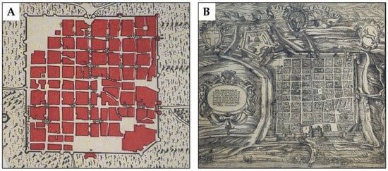 Historical maps of Turin in Roman and late Middle Ages periods. (A) The plan illustrates the configuration of the Augusta Taurinorum within the context of the medieval urban layout (source: ASCT, Tipi e Disegni 64.1.7, in [] p. 18; (B) map of Turin in the early Renaissance (1577) with the new defense walls and the Cittadella fortress (source: Augusta Taurinorum, di Giovanni Caracha, incisione di Giovanni Criegher, 1572. Archivio Storico della Città di Torino, Collezione Simeom, D 1 in [] p. 77).