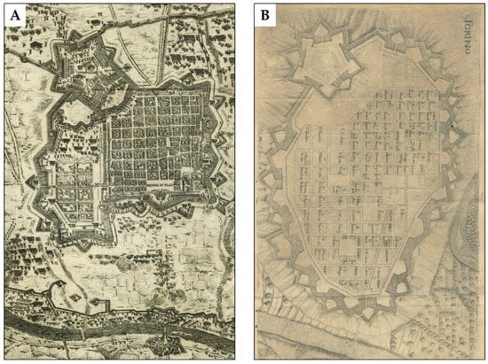 Details of historical maps from the Renaissance and Baroque periods (see Appendix A), focusing on the area of interest and oriented to show the Po River at the bottom of the images. (A) Piano della circonvallazione fatta alla città di Torino dall’Armate di S. Maestà… (assedio del 1640), di Michele Antonio Raynero, incisione di Giovenale Boetto, 1643. ASCT, Collezione Simeom, D 11. In []. (B) Giovanni Abbiati, Pianta di Torino, 1680. Archivio Storico della Città di Torino, Collezione Simeom, D 13. In [].