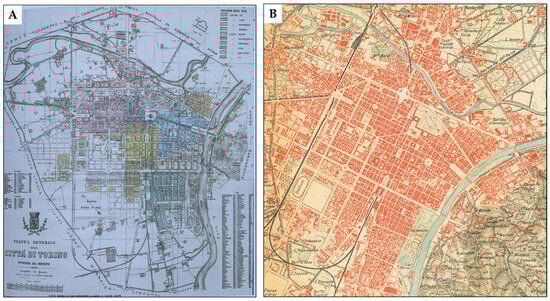 Historical Turin’s city development maps: (A) 19th century, Pianta Topografica disegnata dei geometri Emilio Cabellla e Firmino Caneparo con l’elenco generale dei nomi corrispondenti al numero di ciascun isolato. Litografia a colori, anno 1874 (ASCT, Collezione Simeom, D113, in [], p. 231), and (B) 20th century (Pianta di Torino e dintorni, 1911. ASCT, Collezione Simeom, D135 in []).