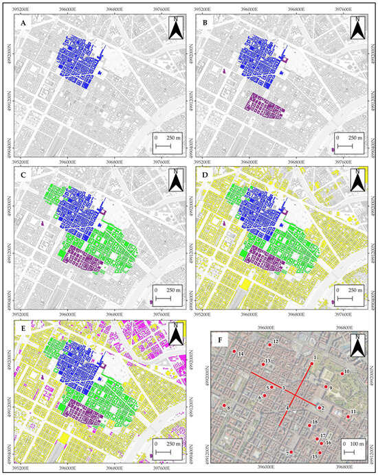 Urban expansion phase results obtained with the MAGUS methodological framework. The five expansion phases are: (A) the Roman period and the Middle Ages (blue), (B) the Renaissance period (deep purple), (C) the Baroque period (green), (D) the 19th century (yellow), and (E) the 20th century (purple). (F) Shows the Multi-Temporal Markers used for the MAGUS expert-based procedure (1: Porta Palatina; 2: Palazzo Madama; 3: Cardo; 4: Decumano; 5: Santi Martiri church; 6: Santa Maria di Piazza church; 7: Santa Cristina church; 8: Mastio della Cittadella; 9: Palazzo Reale; 10: Bastion Verde; 11: Cavallerizza buildings; 12: Santuario della Consolata; 13: Palazzo Barolo; 14: Military districts; 15: Palazzo del Pozzo; 16: Jewish ghetto; 17: Palazzo Campana; 18: Palazzo Carignano). Basemaps: (A–E) BDTRE 2023 1:10,000 []; (F) Google® Satellite.