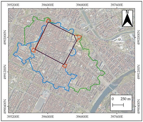 Few remnants of the Roman defensive walls of the city have survived to the present day. As discussed in Section 3.2, two of the four gates still exist, and evidence of wall sections has been uncovered during archaeological excavations []. Additionally, some defensive bastions remain visible along the original wall lines. Furthermore, it is important to note that Roman cities typically had a square shape in the plan. Archaeological studies [,] have revealed that Turin’s Roman walls had one corner chamfered (see Figure 9).