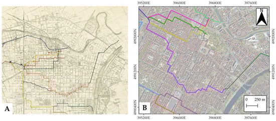 A document from 1882 (Figure 10A) provides valuable insights into the layout of the channels within the city during the 19th and 20th centuries, especially in relation to the urban landscape evolution (Figure 10B). In fact, these channels were chiefly used for agricultural irrigation and as a source of energy for mills and industrial operations, playing a vital role in the city’s economic and social development.