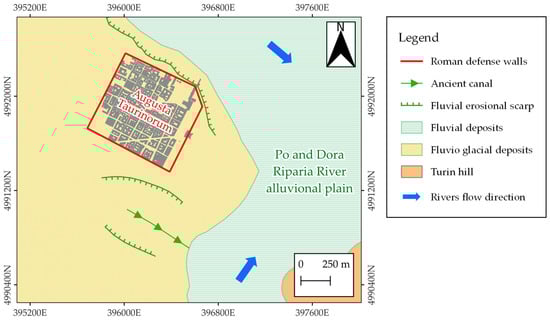 The northeastern scarp corresponds to the fluvial scarp of the Dora Riparia River (Figure 12). This morphological feature marks the boundary between the fluvioglacial fan and the alluvial plain of the Dora Riparia River, which extends to the northeast. Additionally, as shown in Figure 5A, which depicts Turin’s Roman city plan, the southeastern corner of the walls was chamfered. This anomaly is closely related to the Romans’ adaptation to the terrain’s morphology of the fluvial scarp. It is also evident that this boundary was extended in later centuries with the construction of the walls in the Wars of Italy period, which compensated for that section along the Dora Riparia River scarp. As shown in Figure 4B and Figure 11, the walls built in the 14th century were constructed in accordance with natural morphologies while also adding anthropic material to create the typical arrow shape of the defensive walls (i.e., Bastion Verde).