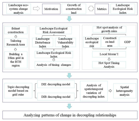 To quantify the coupling between EG and landscape changes, a grid-scale decoupling model was constructed to precisely identify the areas of change. A long-term decoupling analysis was conducted on the EG, ERI, and CAG relationships in the BTH region. Furthermore, this study analyzes the spatiotemporal evolution and heterogeneity of the decoupling outcomes, as illustrated in Figure 2.