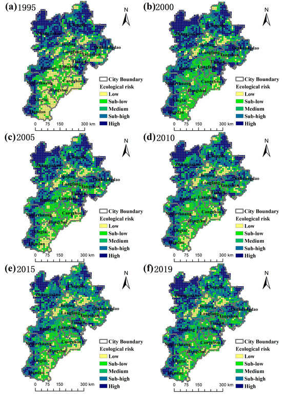 Spatial Distribution of ERI from 1995 to 2019 ((a) Results for 1995, (b) Results for 2000, (c) Results for 2005, (d) Results for 2010, (e) Results for 2015, (f) Results for 2019).